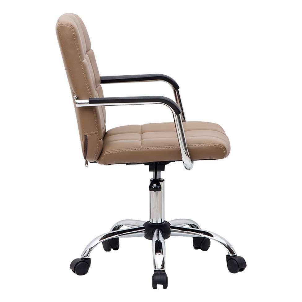 Yeh modern office chair stylish brown faux‑leather upholstery aur comfortable armrests ke saath aata hai, jo aapke workspace ko ek sophisticated look deta hai. Thick padded seat aur cushioned backrest aap ko lambi baithak ke dauran bhi comfort provide karte hain. Durable frame aur stable base is chair ko daily office ya home‑office use ke liye ideal banate hain. Faux leather surface wipe‑clean karna aasaan hai, jo maintenance ko simple aur convenient banata hai.
